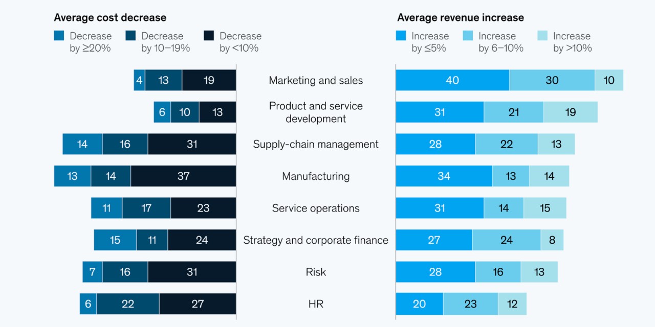 Revenue increases from adopting AI are reported most often in marketing and sales, and cost decreases most often in manufacturing.